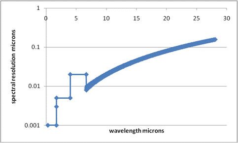 The atmospheric spectral resolution used in scene generation is the lesser of EOIR's maximum atmospheric spectral resolution, shown below, or the one resulting from the selected EOIR Spectral Properties "Number of Intervals" within the selected spectral band.