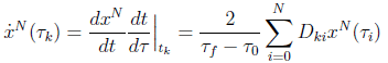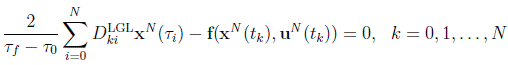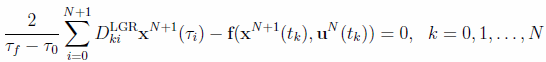 where the symbols are defined in the previous subsection. Following a reasoning like the LGL discretization case, you can see that the LGR differentiation matrix is now non-square, of dimension (N+1) X (N+2), since collocation is not enforced at t = 1. The differential equation constraints in this case reduce to the following set of non-linear equations: