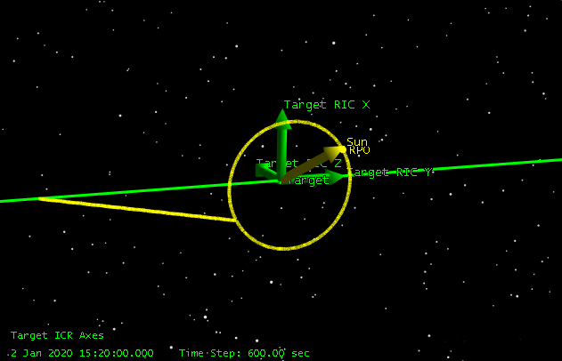 | Sun_LeadTime | Enter the lead (positive values) or lag (negative values) time relative to the Sun. The result is to have the satellite leading or lagging the apparent Sun position so that the proximity operations satellite is not directly in the Sun line. |