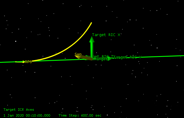 The following picture shows a hop from an initial position on the VBar at -1000m to a final position of +500 m on the RBar over two hours of flight time.