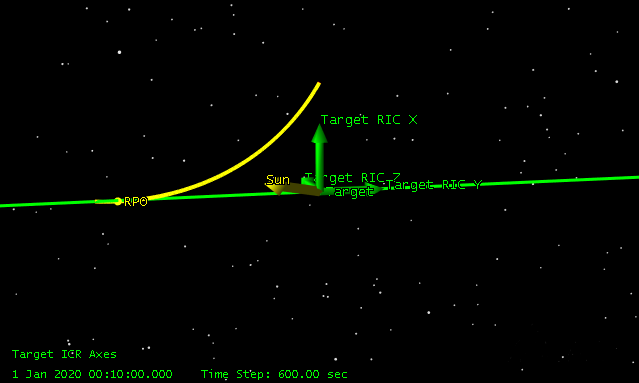 The following picture shows an example hop from an initial position on the VBar at -1000m to a final position of +500 m on the RBar over two hours of flight time.
