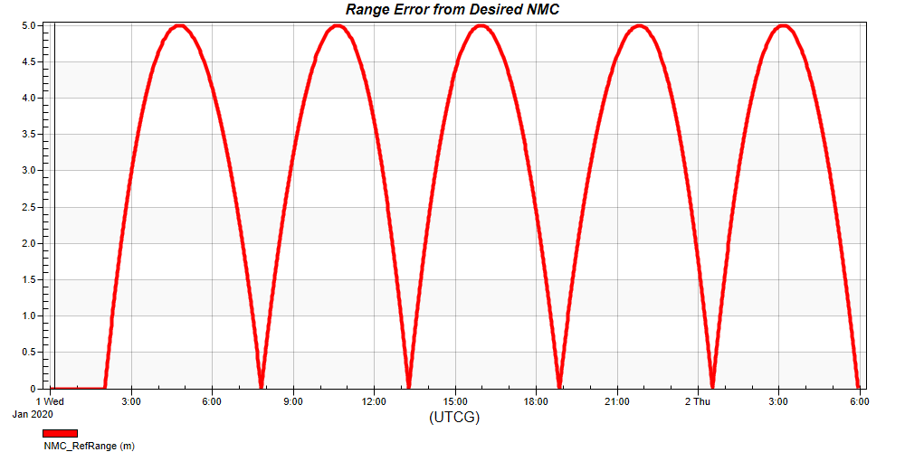 With this sequence, you can specify the duration to maintain the NMC and the maximum error from the desired NMC. From those inputs, this sequence computes all required Delta-Vs to stay within that maximum error from the ideal NMC.