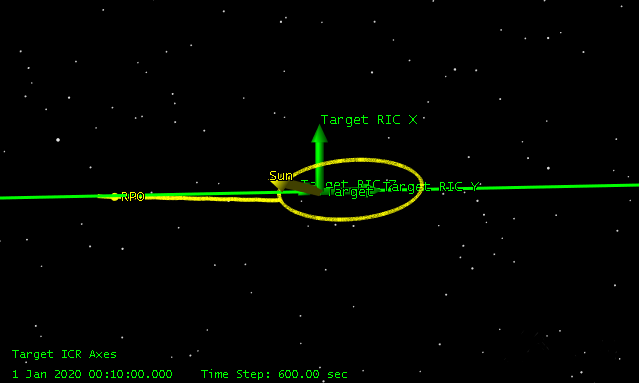 For the special case of an “Equidistant NMC” — the NMC at a near-constant distance to the target — choose the inputs such that the RBar_CrossTrack_Offset is +/-√(3) times the Semi-Minor Axis. Then the VBar_CrossTrack_Offset, InTrack_Offset, and InTrack_Drift are all 0.0. In such a case, the resulting NMC is approximately a constant distance to the target, with that distance being two times the semi-minor axis. Also, for this case, the NMC crosses the VBar.