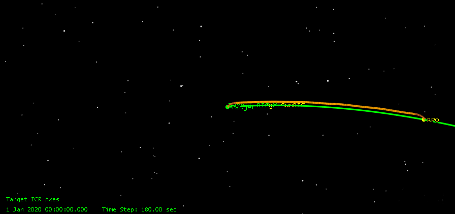 The following picture shows the phase change of a GEO satellite. It drifts from 15 degress east of the target satellite to 0.1 degrees east of the target satellite while also drifting in the minus velocity direction.