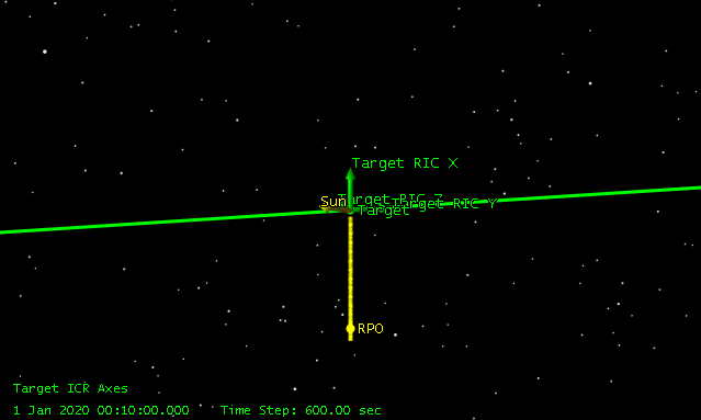 The following picture shows an approach from -1000 meters on the RBar to a final stopping RBar position of -50 meters in a transfer time of two hours.