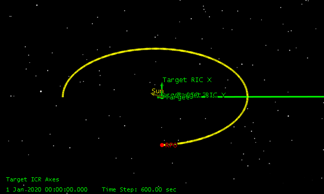 The following picture shows an initial chase satellite position of -1000 meters on the RBar and then the final stopping condition at -2000 meters on the VBar, using a partial NMC to connect them.