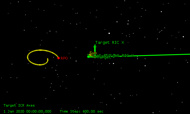 The following picture shows a maneuver to produce a Delta-V of 0.01 cm/sec radial, 0.001 cm/sec in-track, and 0.01 cm/sec cross-track at time zero. The satellite starts at a VBar relative orbit and the post-maneuver propagation is for one day.