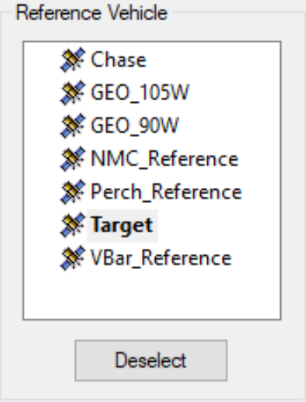 The Set Reference Vehicle RPO sequence sets the reference vehicle for the chase satellite. Generally, this should be the target satellite, but during the rendezvous phase, the reference generally is a different relative orbit than the target, such as a relative VBar position to the actual target.