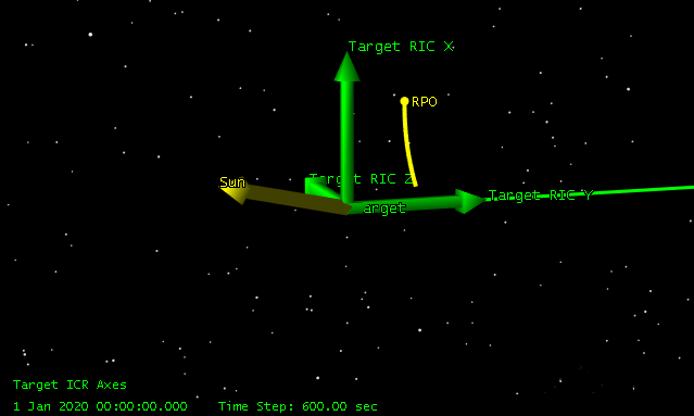 The following picture shows an initial state above the In-track/Cross-track plane. The sequence propagates it with a negative radial rate until it hits the In-track/Cross-track plane of the target. At that point, the sequences propagation terminates.