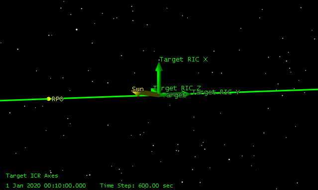 The VBar relative orbit is a stable relative orbit requiring no station-keeping if forces are equal on both the target and the chase satellites. Following this sequence, you can use either the Coast RPO (for matching force models) or Maintain_VBar (if differential forces exist) to propagate the VBar forward in time.