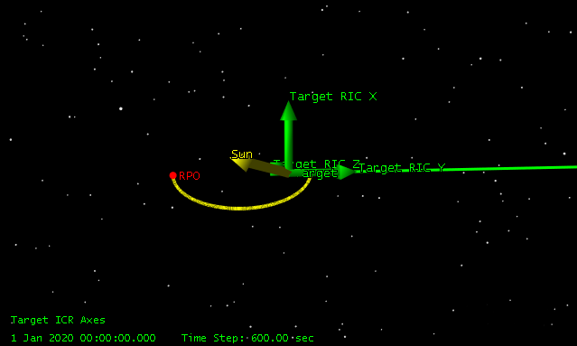 The VBar Hop RPO sequence creates a “hop” for the chase satellite to go from one VBar position to a final VBar position. The method for the hop is to use half of an NMC RPO sequence. The initial maneuver starts the hop, and a second maneuver stops all relative motion upon arrival at the final VBar position. The transfer time of the VBar hop is half of a revolution (since it is half of an NMC). The initial position must be on the VBar or else the sequence will issue an error message and stop.