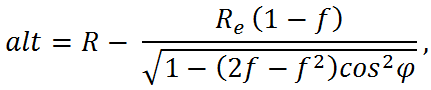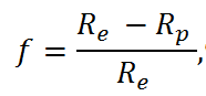 where R is the distance from the center of the oblate spheroid, Re is the equatorial radius, f is the flattening factor and φ is the spherical latitude. The flattening factor is related to the equatorial and polar radii as: