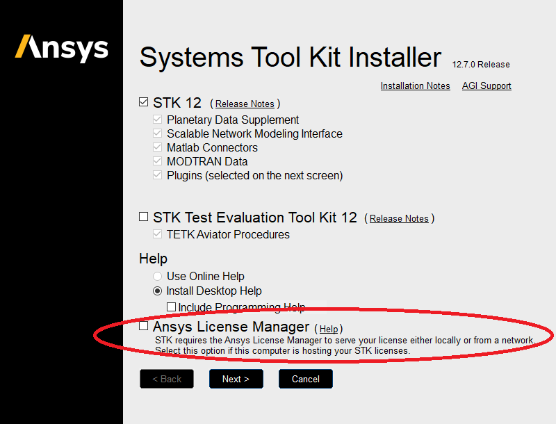 If you are installing the License Manager on the same machine where STK will be installed, you can choose to install the Ansys License Manager during the STK install by selecting the check box outlined below.