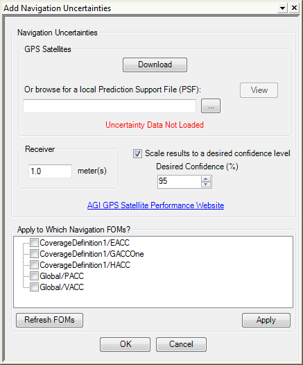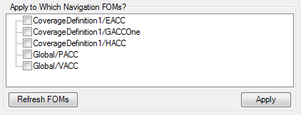 Once the uncertainties are defined, select which Navigation FOMs should be updated with these uncertainty values. Note that only the FOMS in your scenario that are configured as Navigation Accuracy FOMS will be displayed in this list. The FOMS are listed using their coverage definition / FOM name. Check each FOM to which you would like the uncertainties applied. Note that if you opened this tool by right-clicking on a FOM, that FOM will already be selected for you.