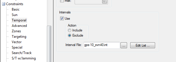 The GPS satellite outage tool creates interval files for each satellite that has an outage in the SOF, for the duration of the scenario time period. Once applied, you can view the outages by selecting a satellite for which an outage was applied, then opening its Properties. On the properties screen, scroll to the Constraints section and click the Temporal link. You’ll notice that Intervals have been set to Use and the action has been set to Exclude.