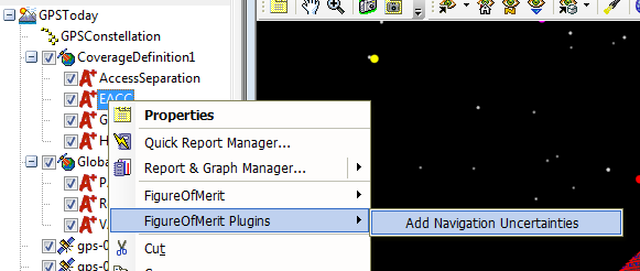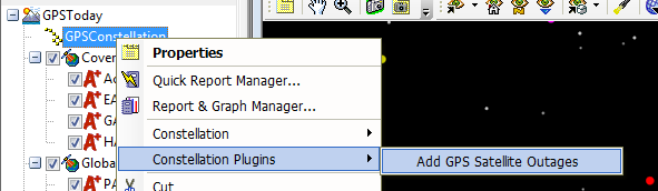 You can also load GPS satellite outage data by right-clicking on a constellation object and selecting the Constellation Plugins, then Add GPS Satellite Outages option.