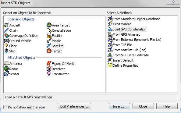 Before using the GPS Satellite Outage tool, you must have a Constellation object in your scenario containing the GPS satellites. Loading the GPS satellites from the Load GPS Constellation option on the Insert STK Objects dialog (shown below), will automatically create the constellation object for you.