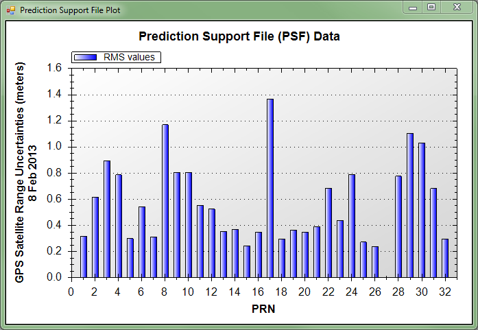 You can use your own RMS values. Simply download a PSF file from the link above and replace the “URE=” value in each PSF file’s PSF_RECORD with your own values for each GPS satellite. The SVID attribute in the PSF file corresponds to the GPS Satellite’s PRN number.