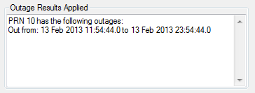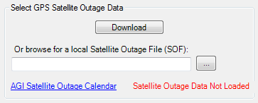 Satellite Outage Files (SOFs) provide information about GPS satellite outages. Taking these outages into account is crucial for obtaining an accurate navigation error prediction. Without considering outages, your navigation errors may be smaller than actually observed. The SOF provides GPS outage information for historical, current and predicted outages. The historical outages go back to 1998. The US Air Force produces a new SOF each time a new outage is completed, experienced or predicted. Using the GPS satellite outage tool will add all appropriate GPS satellite outages to your scenario.