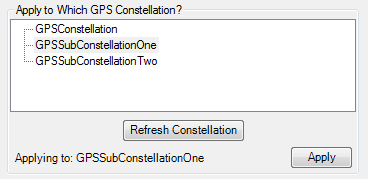If you have a constellation object selected, or opened the GPS satellite outage tool by right-clicking on a constellation object, that constellation will already be selected. Once selected, click the Apply button to apply any outages in the SOF data to your scenario. Note that you may click OK instead of Apply. This will apply the outages and then close the window. If you have added or deleted constellation objects in your scenario, click the Refresh Constellation button to re-populate the selections.