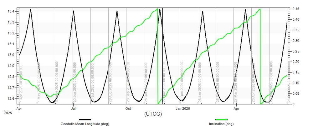 Note the spikes in the longitude to when the satellite approaches the prescribed upper limit of 13.5 degrees, triggering the East-West station-keeping Automatic Sequence. The satellite's longitude curves down towards the limit of 12.55 degrees before increasing once again. Note also the satellite's inclination as it gradually rises towards the limit of 0.45 degrees. Reaching the limit triggers the North-South station-keeping Automatic Sequence, bringing the inclination down to the target value of 0 degrees.