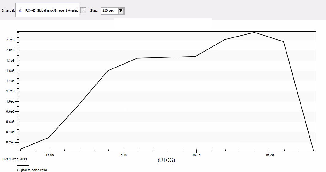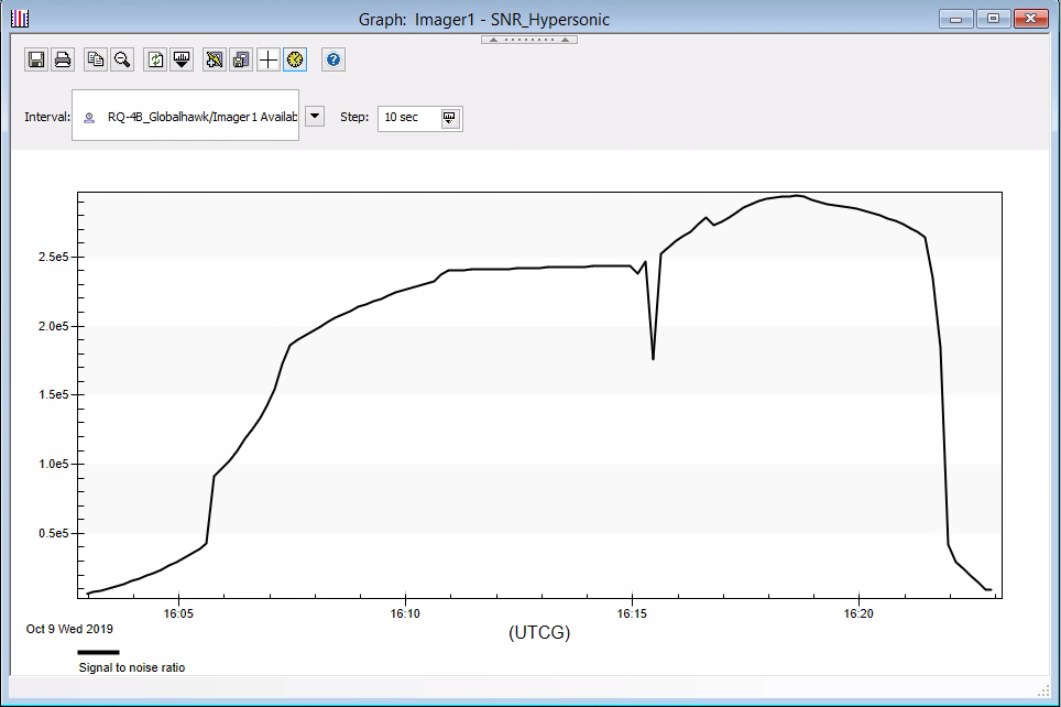 From what you modeled of the launch, the first ~15 min (900 EpSec) are when the HXRV_X43 is attached to the HXLV_Pegasus. At ~925 EpSec there is a dip. The HXLV_Pegasus is raising to a higher altitude before the HXRV_X43 is deployed. Set the scenario time to 1000.00 EpSec and step forward in time to observe the deployment. It corresponds to the slight bump in the SNR before the peak. The peak at ~1100.00 EpSec corresponds to the moment the HXRV_X43 is the closest to the RQ-4B_Globalhawk, which is the platform for the thermal infrared sensor. Finally, recall that the HXRV_X43 descended into the ocean, which you be follow in the remainder of the graph.