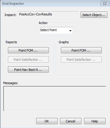- Click a grid point in the 2D Graphics window. In the Messages section, you will receive Point Location, Point Area, how long the Point is Covered by a maximum number of assets, and the value of Maximum Navigation Accuracy at that location.