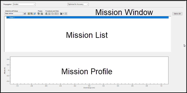 The mission window is used to define the aircraft's route when Aviator has been selected as the propagator.