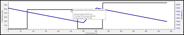 - Place your cursor anywhere along the X Real Time Factor line. You will see Downrange, X Real time Factor and Fuel State.