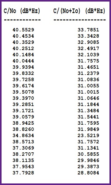 - Scroll to the right and locate the C/No (dB*Hz) and C/(No+Io) (dB*Hz) columns in your generated report. The C/(No+Io) (dB*Hz) column measures interference.