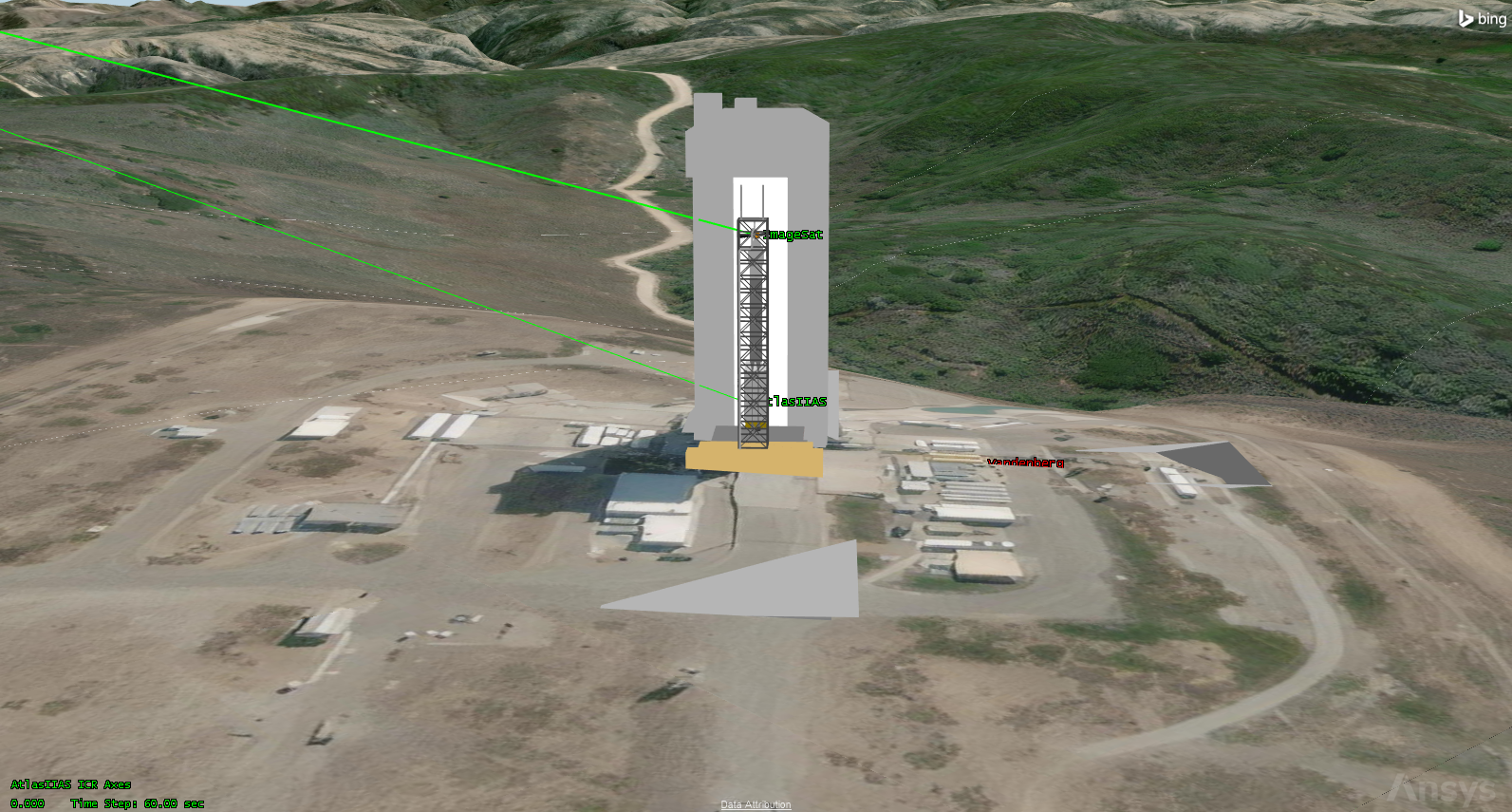 ) models launchpad SLC-3E of Space Launch Complex 3 at Vandenberg Space Force Base (SFB). Its 3D model was imported from the STK Standard Object Database. The shadow on the ground you can see in the Bing Maps imagery is the shadow of the actual launch tower of the SLC-3E launchpad. In addition to the positioning being technically accurate, the scenario also uses a 3D model (atlas-lp.mdl) of the real Atlas launchpad at the site.