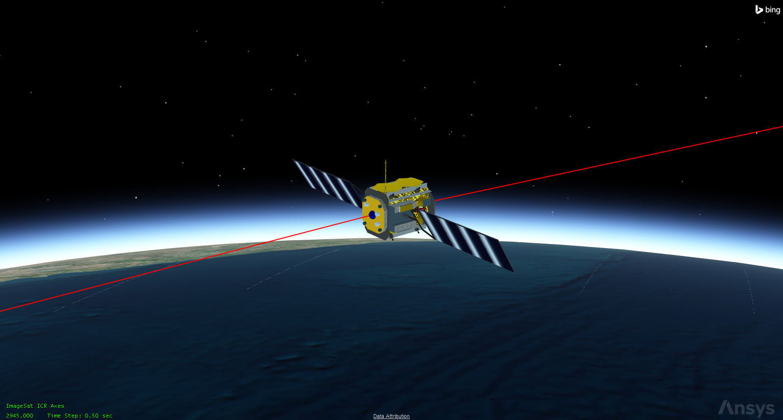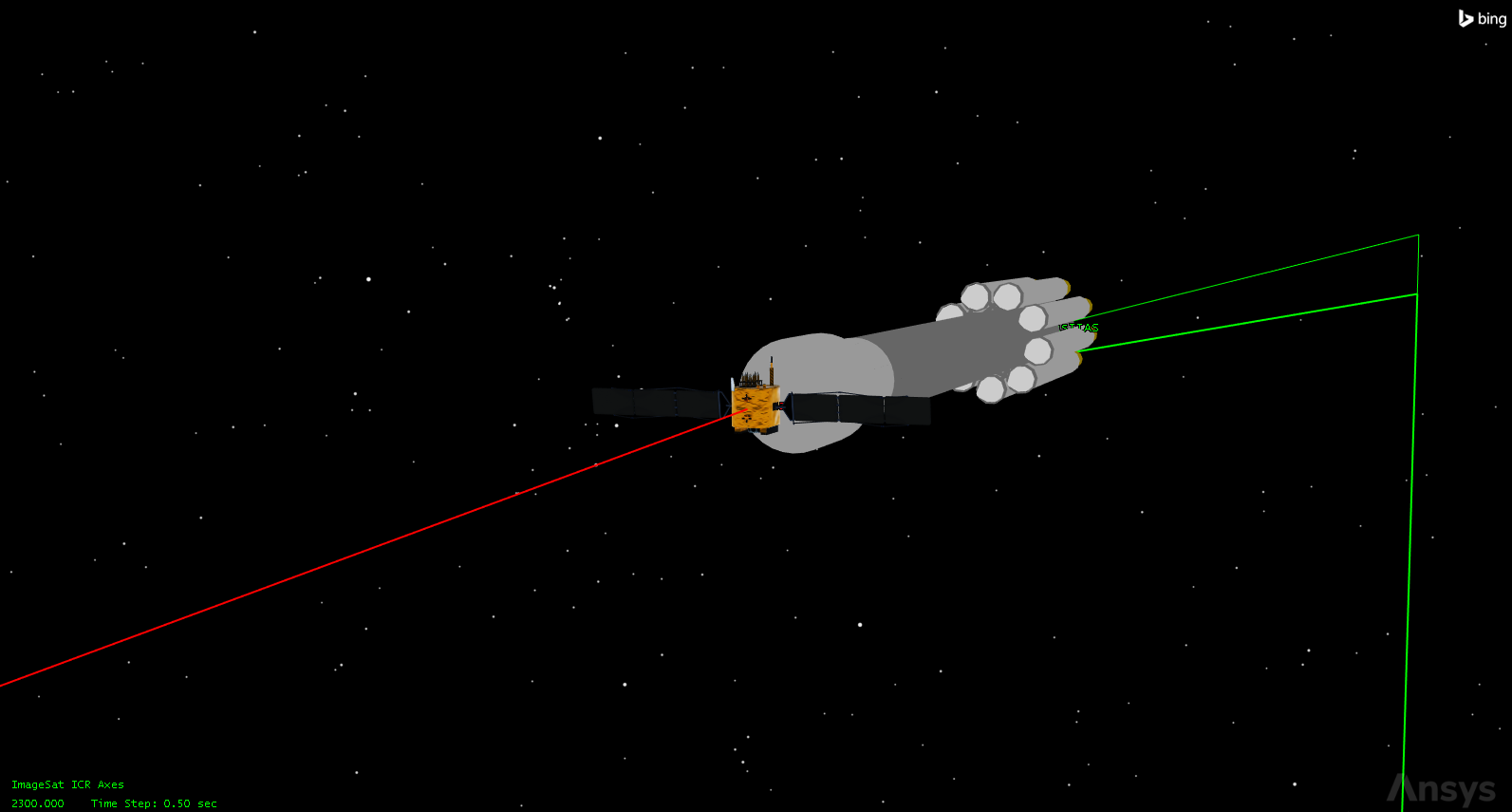 ImageSat separates from AtlasIIAS at 2,300 epoch seconds. Set your animation time to 2,290 epoch seconds in order to see the separation and solar panel deployment.