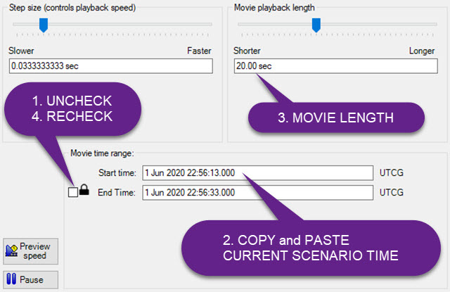 In the Movie Wizard, creating the start and stop time of your movie sets those times in the Scenario () objects Basic - Time Animation field. It's a good idea to reset these time so that you can animate your complete analysis time (in this case four hours).