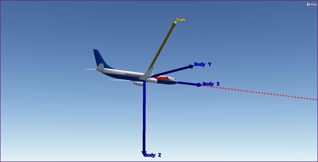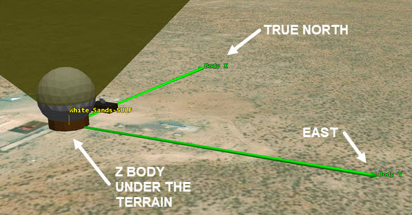 Facility, place, and target objects have body-fixed coordinate axes, which align the X axis along local horizontal North direction, the Y axis along local horizontal East direction, and the Z axis along local Nadir direction (i.e., opposite to local surface normal). Therefore: