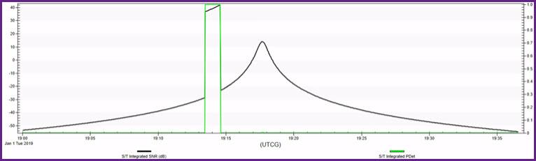 When the private plane flies through the beam, S/T Integrated PDet and SNR (dB) spike. The S/T Integrated SNR (dB) rises as the range between the radar and the aircraft decreases. At the beginning of the graph, the private plane is approximately 66 kilometers away. It is about three (3) kilometers away at the time of closest approach. The S/T Integrated SNR increases in the middle of the graph because the range decreases and the private plane is in a side lobe.