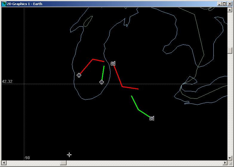 - Animate the scenario. You should now see two ship icons and two ground vehicles. The red paths represent enemy vehicles and the green paths represent friendly vehicles.