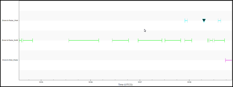 Create a graph that provide a quick view of which radar tracks the drone the longest. The first tracking time is at 1 Dec 2023 19:04:33. The scenario start time is 1 Dec 2023 19:00:00.000 UTCG. If you generate the graph using default analysis times, there will be over four (4) minutes of space in the graph. Remove that space by changing Time Properties. You can copy and paste times from the Complete Chain Access report into the Time Properties section and make some minor time adjustments.