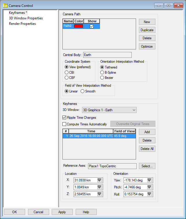 The X, Y, and Z values of Location and the Yaw, Pitch and Roll values of Orientation, at the bottom of this page, displays the highlighted keyframe in that coordinate system. Selecting a different Coordinate System will not alter a keyframe. A keyframe can only change if you first edit these fields and then click Add.