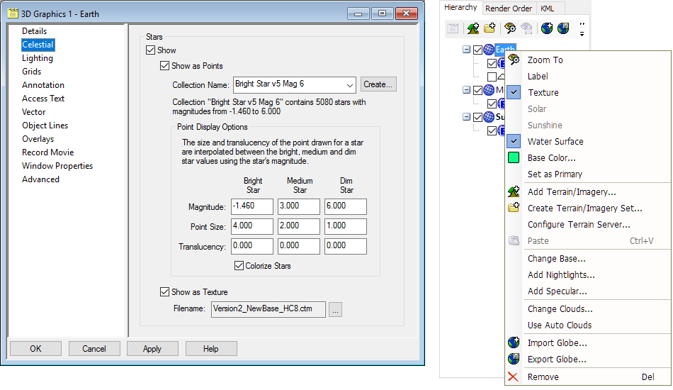 To enhance your 3D Graphics window, you can add a high resolution Nightlights texture, animated water surfaces, a global specular highlight, and world cloud textures. Some of these visual elements are included in the STK install and the rest are on the supplementary data disk. You can obtain even more additional textures on the AGI Data Disc site. Note that you need to log in using your AGI web account credentials to access the Sofware Downloads site.