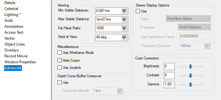 Lighting parameters are on the 3D Graphics - Lighting page. You can see a complete description of the lighting panel here. STK's default lighting source is the Sun. To ensure good contrast, set the Sun Lighting as follows: