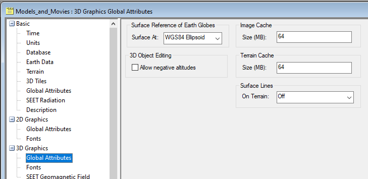 You can store global textures and terrain in RAM rather than your hard drive, to improve performance. Under the Scenario Properties on the 3D Graphics - Global Attributes page, the settings for Image Cache and Terrain Cache let you specify the amount of system RAM to set aside for this. STK will only use this RAM if it is needed, on a per scenario basis. If you experience the 3D window refreshing slowly, blurred textures, or artifacts in the 3D window, you may need to increase the size of your cache.