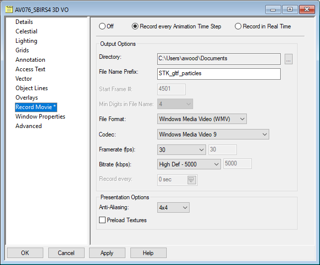 (Start) on the animation toolbar. STK will begin writing either still frames or compile a movie file to your hard drive. It does not control the camera. Record Movie will record the 3D Window even If no camera path is activated. Recording will continue until you reach the Stop Time of your scenario, or you press