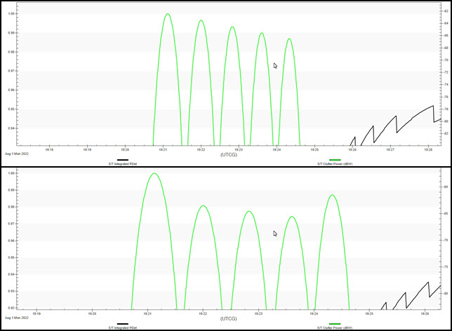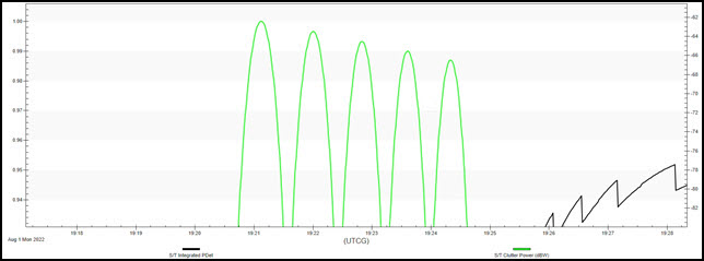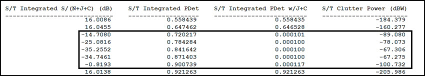 The value at 1 Aug 2022 19:22:42.00 is above 0.800000. However, the next column to the right (S/T Integrated PDet w/J+C) the value is 0.000100, which is very low. From this data, you can determine that clutter is degrading your system. You can see the clutter increase in the next column, S/T Clutter Power (dBW). As the clutter power increases, your S/T Integrated PDet values decrease. You can also see that S/T Integrated S/(N+J+C) (dB) (SNR) is greatly affected by increased S/T Clutter Power (dBW).