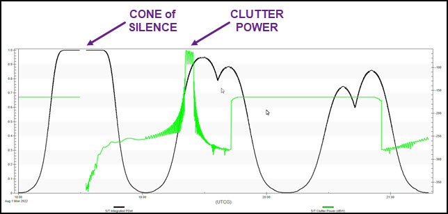 There are two areas of interest in the graph. First, you can see a break during the first period of tracking the aircraft. This is the aircraft passing through the radar's cone of silence. During the second period of tracking, you can see where clutter effects your PDET.