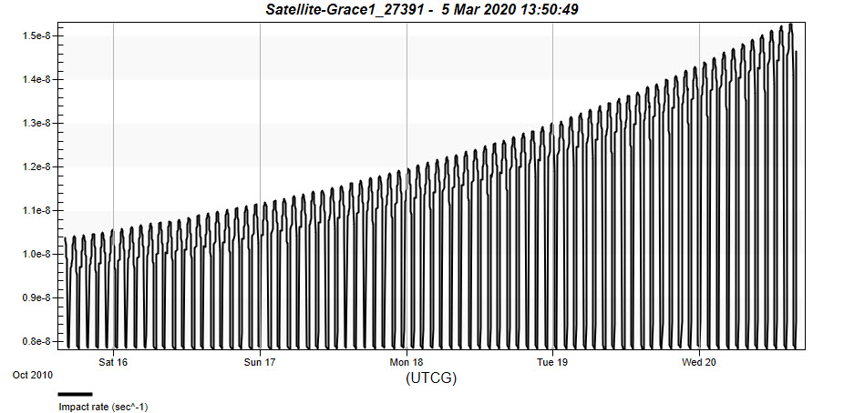 Note the short up-and-down variation of the damaging meteoroid flux of each orbit. This is due to the satellite passing behind the Earth relative to the respective travel directions of the various meteor showers active during this time period. The overall plot trend, peaking late on 17 Oct, is due to the variation of the Ursids meteor shower activity. The Ursids annual shower is a brief, but intense meteor shower. This trend will vary throughout the year, as it depends on the specific periods of activity of the many showers contained in the meteoroid environment database.