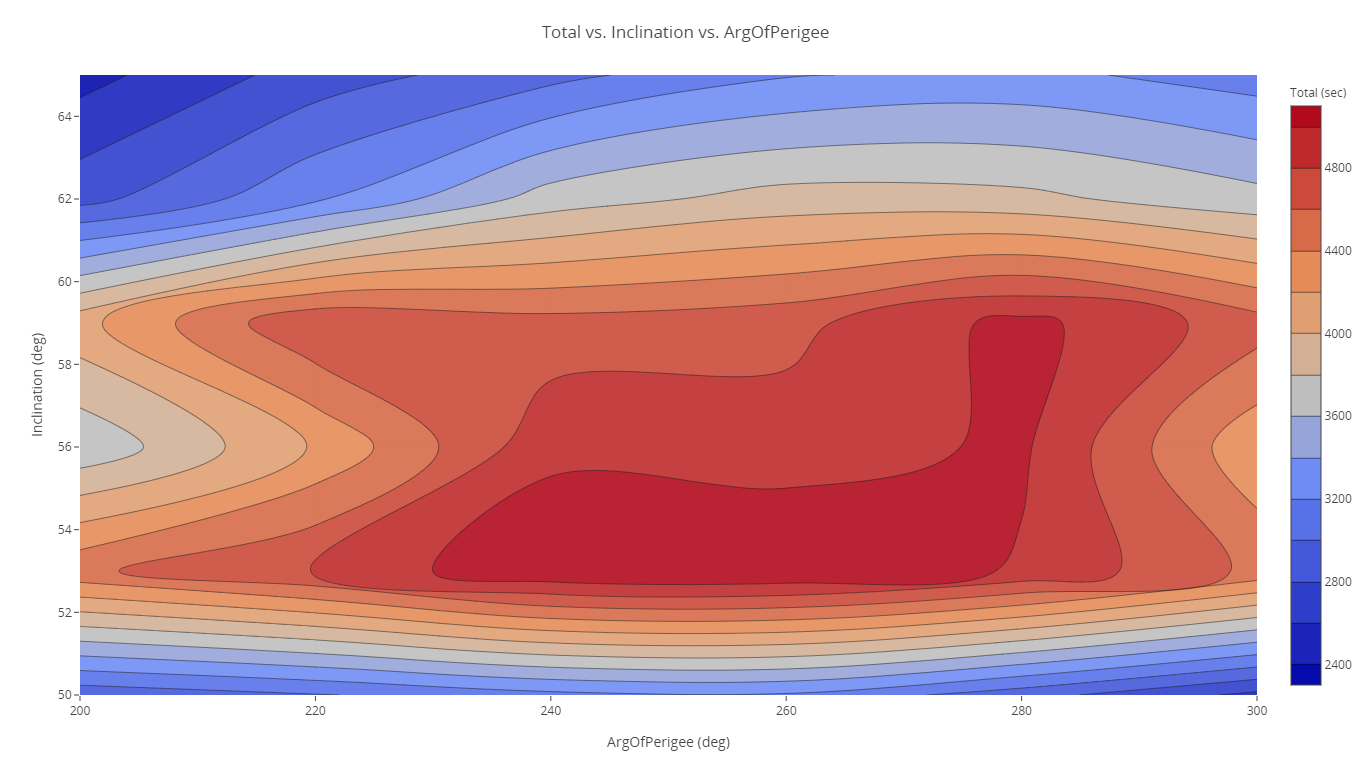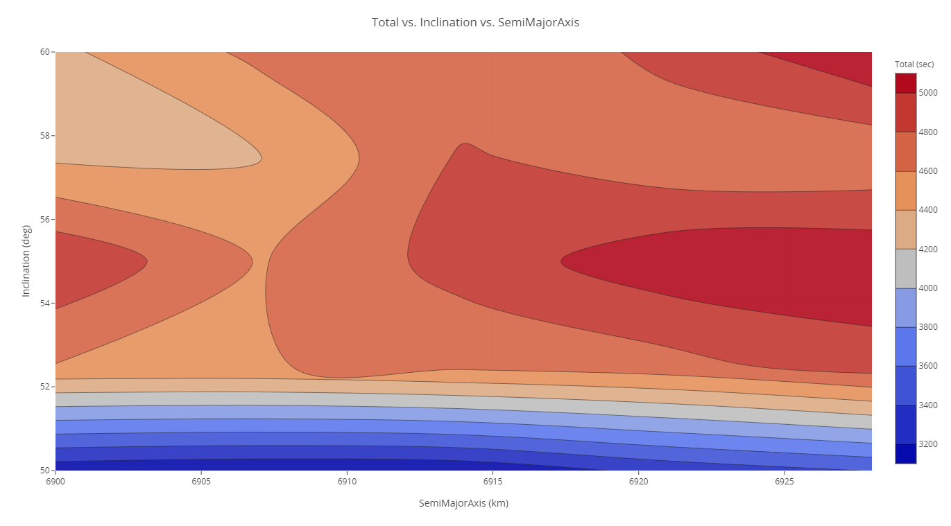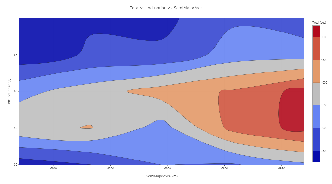 Now that you have performed Parametric Studies on each parameter, you have an idea for the general ranges where the duration is the greatest for each orbital parameter variable (semimajor axis and inclination). These two parameters can be plotted together efficiently to find the best combination that maximizes.