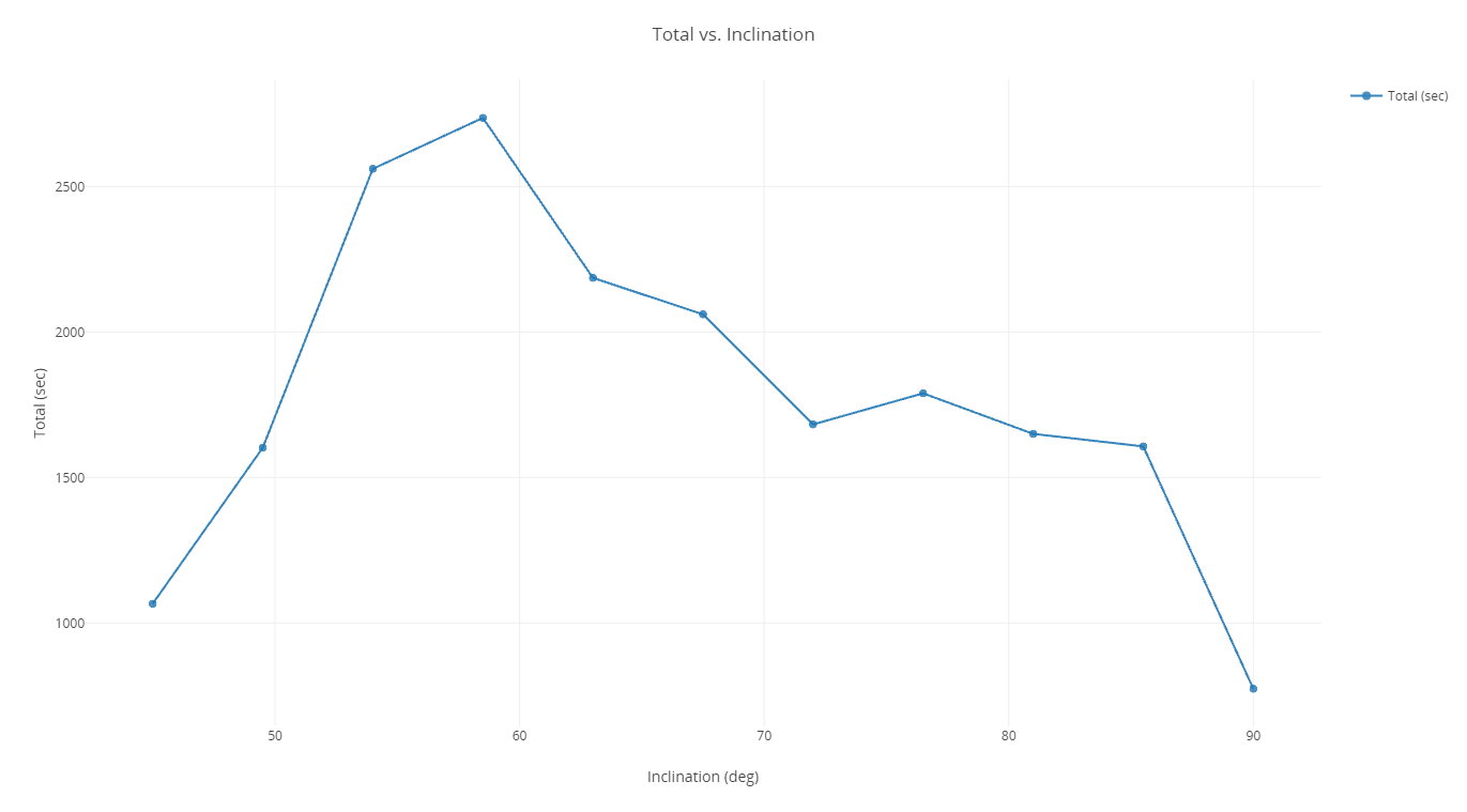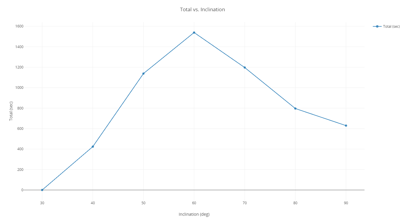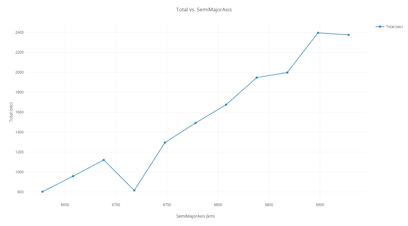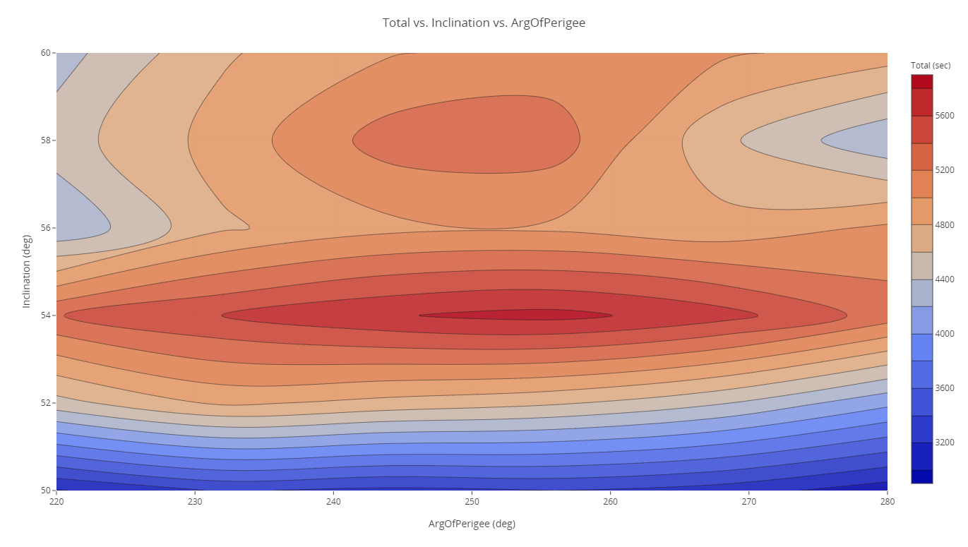 Now that you have performed Parametric Studies on each parameter, you have an idea for the general ranges where the duration is the greatest for each orbital parameter variable (semimajor axis and inclination). These two parameters can be plotted together efficiently to find the best combination that maximizes.