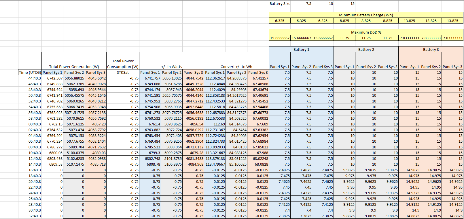 You will find that the best solar panel-battery combination is Battery 1 with Panel System 3. Batteries 2 and 3 were not chosen, as they would surpass their maximum-rated depth of discharge of 15%; according to the Final Power Analysis, the maximum DoD for Battery 1 does not surpass this rated value. After determining that there is one viable battery option, the solar panel system was chosen based on the aspect of cost. The most cost-effective EPS combines Battery 1 with Panel System 3, since that solar panel system has the lowest cost of $14,000.