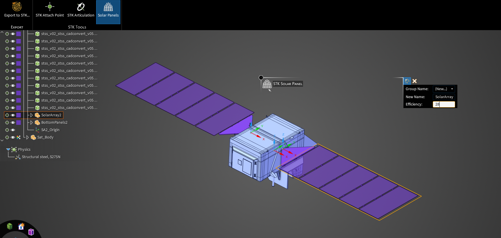 Set the solar panel groups within a 3D object model of the satellite in a way that the STK application can register them using the Ansys Discovery™ 3D product simulation software. The SolarArray component includes the top faces of each set of solar panels in the 3D model, which will be used to create a solar panel group that includes all of the solar panels on the model