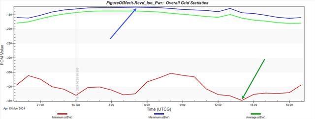 You can use the graph to quickly find the lowest and highest received isotropic power (dBW) values during the 24-hour analysis.